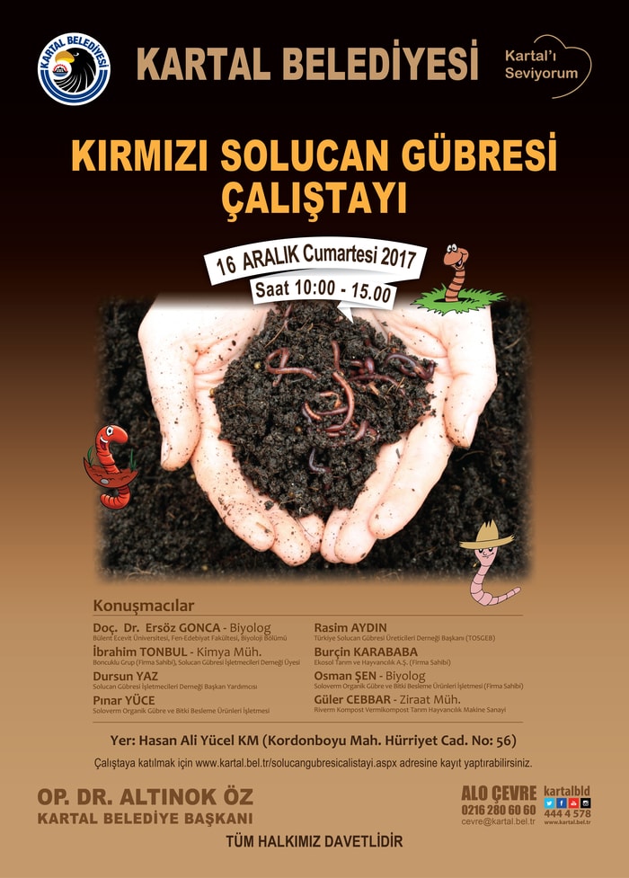 Kartal Belediyesi Çevre Koruma ve Kontrol Müdürlüğü tarafından düzenlenecek “Kırmızı Solucan Gübresi Çalıştayı”, 16 Aralık 2017 Cumartesi günü 10.00–15.00 saatleri arasında Kartal Belediyesi Hasan Ali Yücel Kültür Merkezi’nde gerçekleştirilecek.