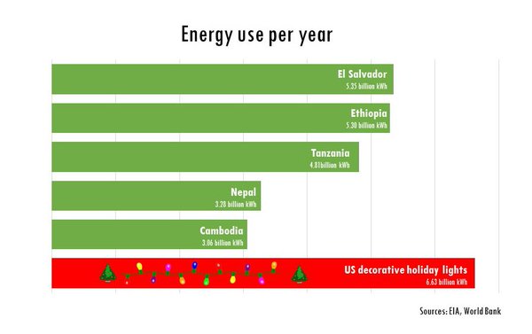Bu rakamı özellikle gelişmekte olan El Salvador (5,35 milyar kilowatt saat), Ethiopya (5,3 milyar kwh) ve Tanzanya (4,81 milyar) gibi ülkelerin yıllık elektrik tüketimi ile karşılaştırınca boyutu anlaşılıyor. En fazla bir ay süren Noel süsleri, 3,06 milyar kwh elektrik tüketen Kamboçya ve 3,28 milyar kwh tüketen Nepal’in ise neredeyse iki katı. Liste ise bu şekilde uzayıp gitmekte.