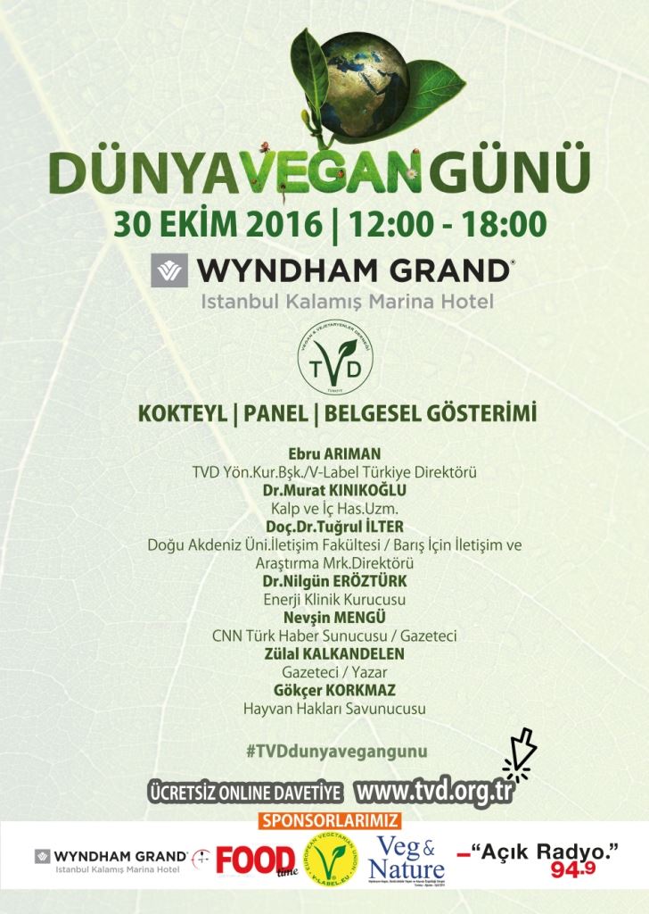 Vegan ve Vejeteryanler Derneği tarafından Wyndham Grand İstanbul Kalamış Marina Hotel sponsorluğunda bu sene ilk kez kapsamlı bir Dünya Vegan Günü etkinliği planlanıyor.