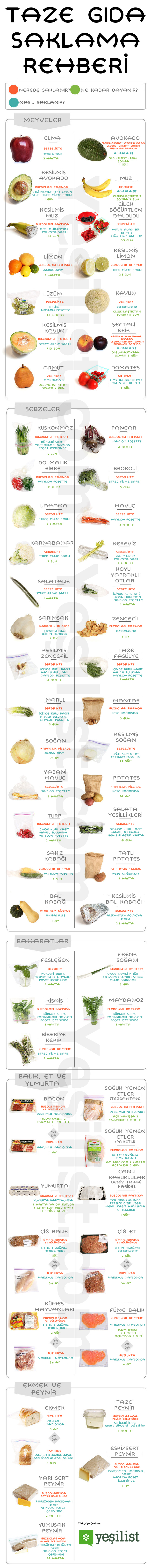 Satın aldığınız taze gıdaları nerede, ne şekilde saklamanız gerektiğini, hangi gıdadının ne kadar süre taze kalacağını açıklayan kapsamlı bir tablo hazırladık.