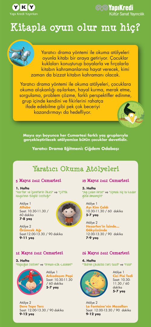 Yapı Kredi Yayınları'nın, çocuklar için düzenlediği atölyelerde yaratıcı drama yöntemiyle oyun ve okuma birleştiriliyor.
