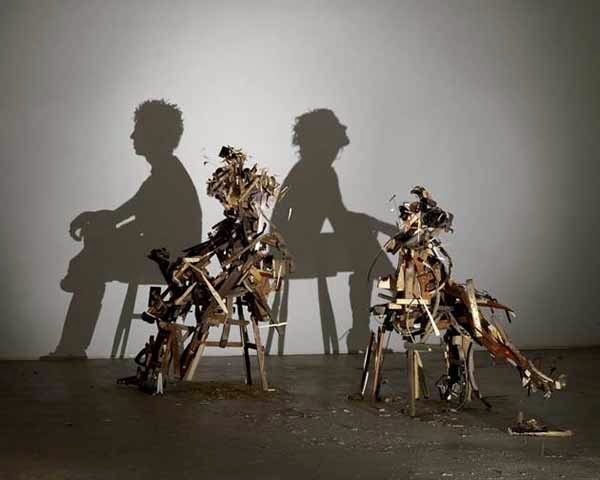 Tim Noble ve Sue Webster'ın karşıdan ışık verildiğinde duvarda değişik resim yansımaları oluşturan çöp yığınları Unexpected Shadows (Beklenmedik Gölgeler) sergisinde.