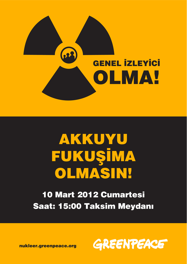Nükleer santrallere sırtını dönmek ve Akkuyu'ya nükleer santral kurulmasının önüne geçmek için 10 Mart Cumartesi günü saat 15:00'te eylemdeyiz!