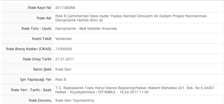 Rize'nin Öamlıhemşin ilçesine bağlı Ayder Yaylası 'kentsel dönüşüm ve gelişim projesi' adı altında imara açılıyor. 110 hektarlık alanı kaplayan projenin ihalesi 6 Şubat 2017 günü saat 11:00’da TOKİ’nin İstanbul Hizmet Binası’nda gerçekleşecek.