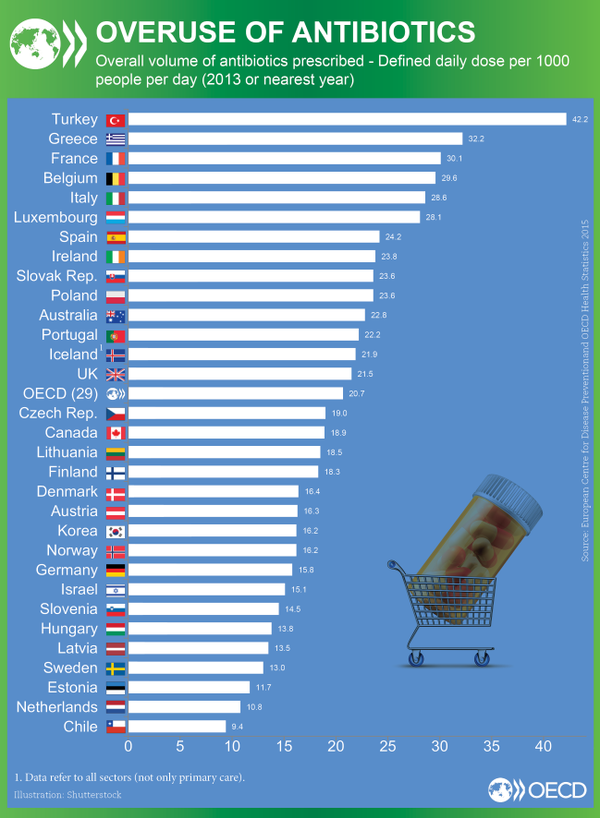 OECD tarafından hazırlanan yukarıdaki tabloda ‘aşırı’ antibiyotik kullanılan ülkelerin bir listesi yer alıyor. Türkiye bu sıralamada 1000 kişiye düşen 42,2 dozla birinci sırada. Türkiye’yi 32,2 dozla Yunanistan ve 30,2 dozla Fransa izliyor.