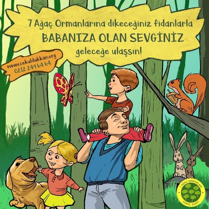 Bir kişinin bir yılda tükettiği kadar doğal kaynağı temsil eden 7 ağaç ile 7 Ağaç Ormanı oluşturan ÇEKÜL’e siz de babanız adına destek olabilirsiniz. Bu adrese tıklayarak siz de babanıza olan sevginizi “geleceğe ulaştırabilirsiniz”.
