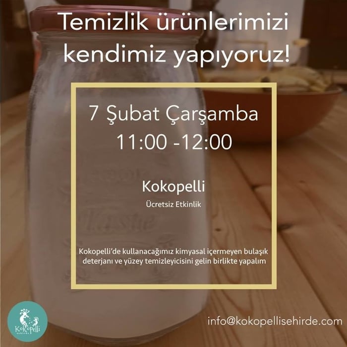 Sarıyer’de çocuk ve yetişkinler için sürdürülebilir yaşam ve ekoloji odaklı öğrenme ve deneyimleme alanı olarak kurulmuş Kokopelli Şehirde Çarşamba günü sizi evinize giren deterjan ve temizlik ürünlerinin zararlarından bahsedip, tüketimlerinizi değiştirme yolunda atabileceğiniz adımlar üzerine bir sohbete ve bir yandan da birlikte bulaşık deterjanı ve yüzey temizleyicisi yapacağınız bir etkinliğe çağırıyor.
