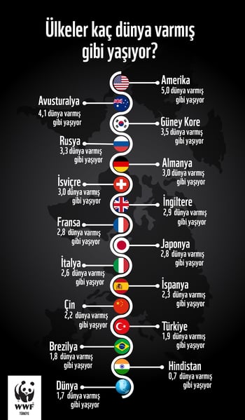 Küresel Ayak İzi Ağı’nın verileri insanlığın her yıl boyunca 1 değil 1,7 dünya kadar kaynak tükettiğini ortaya koyuyor. Her ülkenin kaynak kullanım hızı farklı olduğu için, insanlığın tek bir ülke gibi tüketim yapması durumunda kaç dünya gerektiğini de görebiliyoruz.