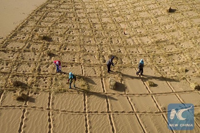 Samanlar ile beraber ızgara şeklinde sistematik bir yapı oluşturan çiftçiler, Çin’in kuzeybatısında bulunan bu bölgedeki kumul tepelerin yayılmasını engellemek istiyorlar. Bölgede bulunan yere yönetim tarafından 2015 yılında başlanan proje 6 yıl içerisinde ekolojik bir duvar oluşturup, çölleşmeyi engellemeyi hedefliyor.