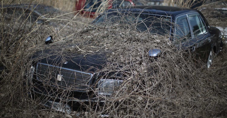 2. Büyüyen yabani otların arasına gömülmüş, kullanılabilir durumda bir araba.