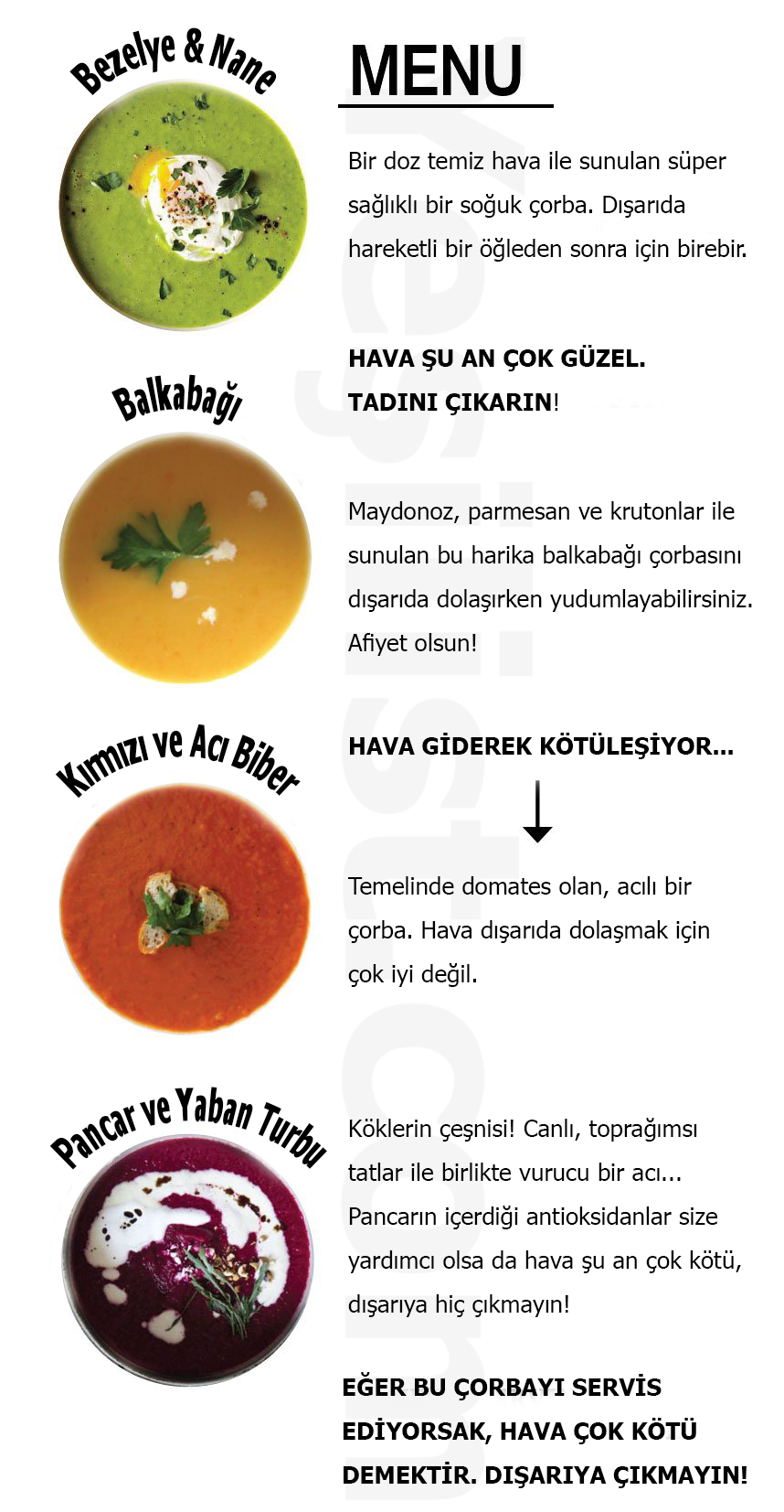 Çorbalar yeşil rengi ile temiz havanın sinyalini veren bezelye çorbası ile başlayıp, hava kötüleştikçe sarı renkteki balkabağı çorbasından kırmızı biber ve acılı çorbaya, ve havanın artık alarm vermesi ile en son göz yaşartıcı ve mor renkteki kırmızı pancar ve yaban turbu çorbasına dönüşüyor.