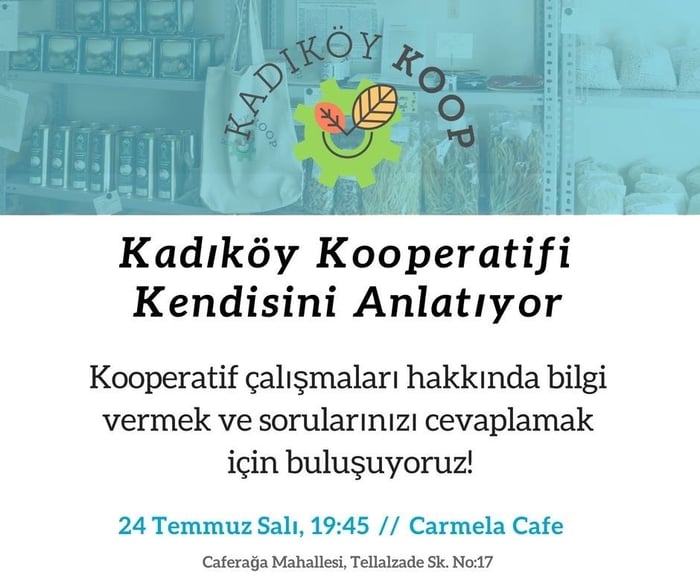 Kadıköy kooperatifi çalışmaları hakkında bilgi vermek ve kooperatif ilgilerinin sorularını yanıtlamak için bu sefer Caferağa’da bulunan Carmela Cafe’de buluşuyor.