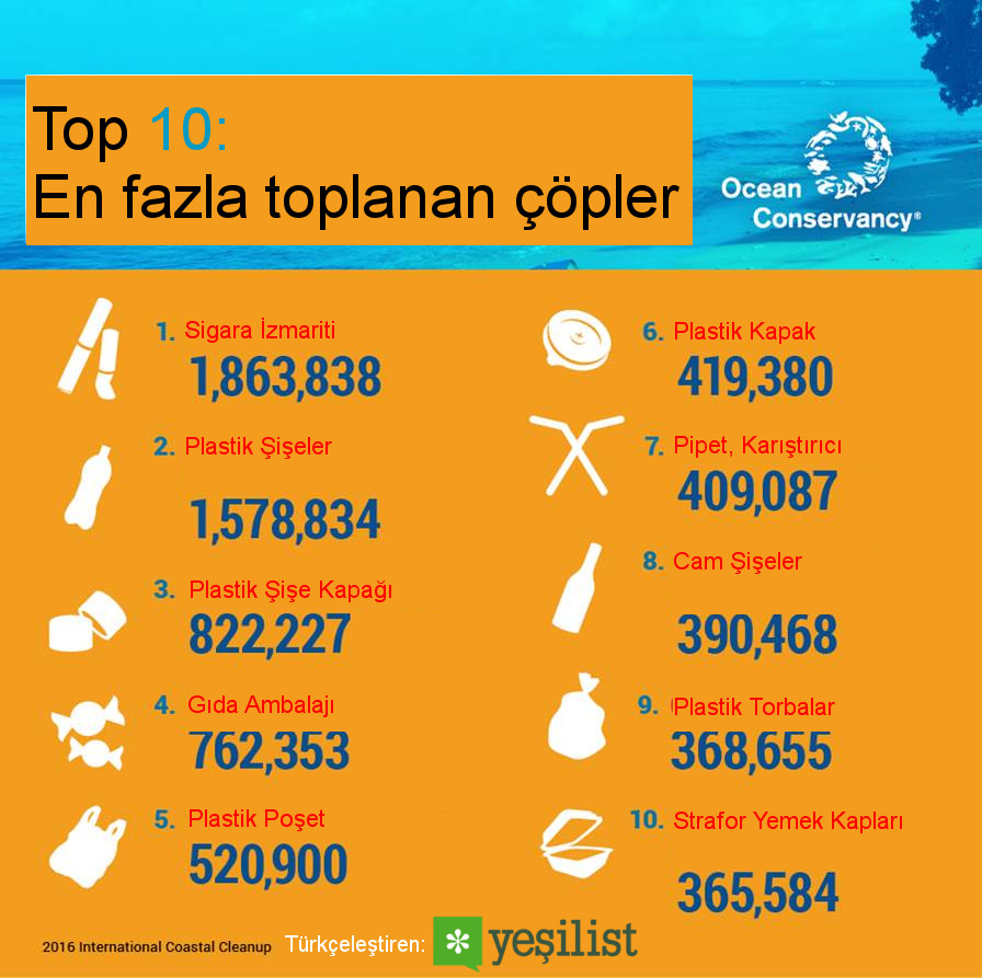 Kumsallardan en çok toplanan çöpler ise; sigara izmariti, plastik şişeler, gıda ambalajları, plastik şişe kapakları ve pipetler. Bunlar özellikle deniz kuşlarına ve kaplumbağalarına karşı ölümcül bir tehlike yaratıyor.