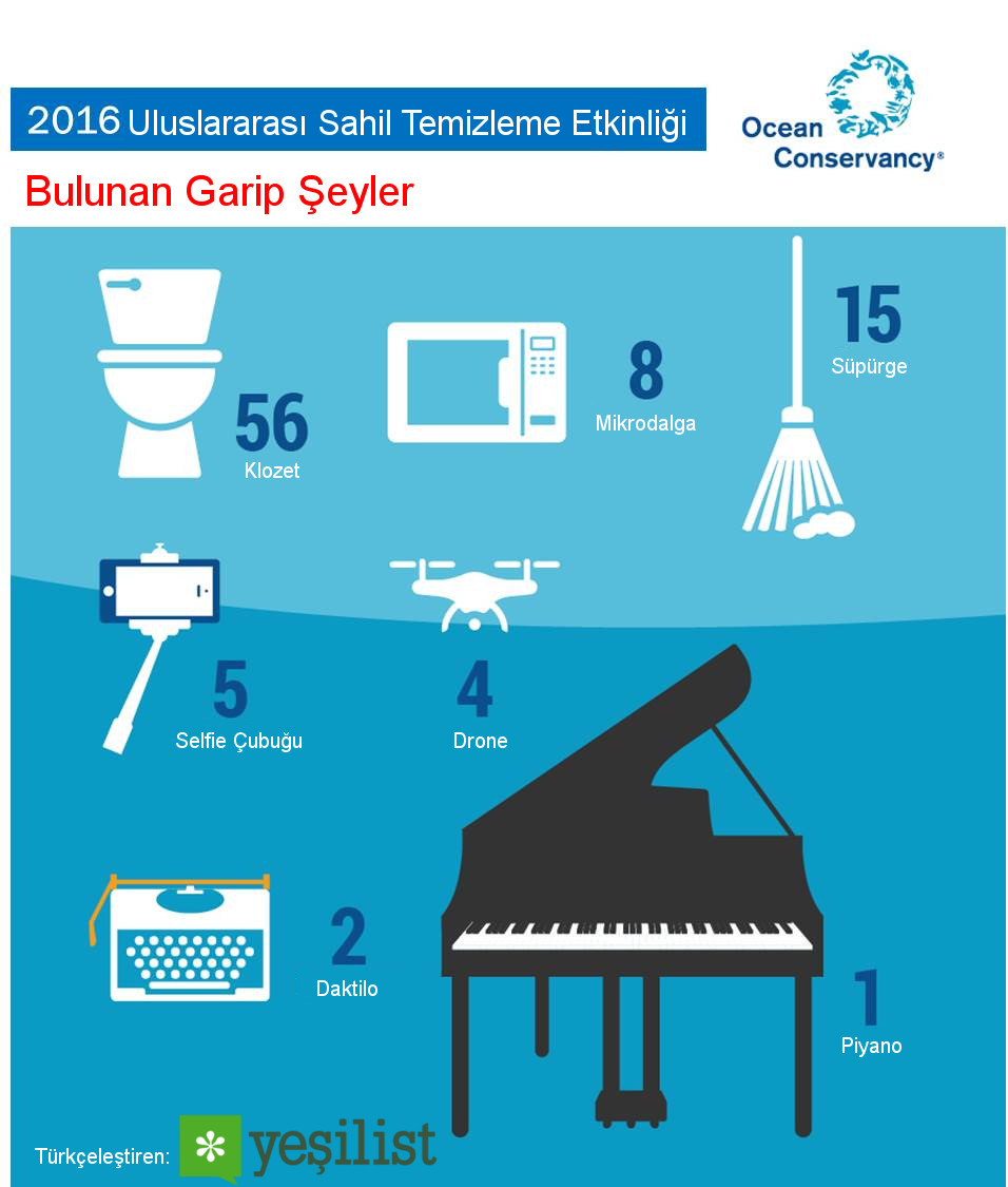 Sahilde çöp olarak buluna garip şeylerde var tabii ki. Bu yıl 56 klozet, 8 mikrodalga, 15 süpürge, 5 selfie çubuğu, 4 drone, 2 daktilo ve 1 de piyano bulunmuş.